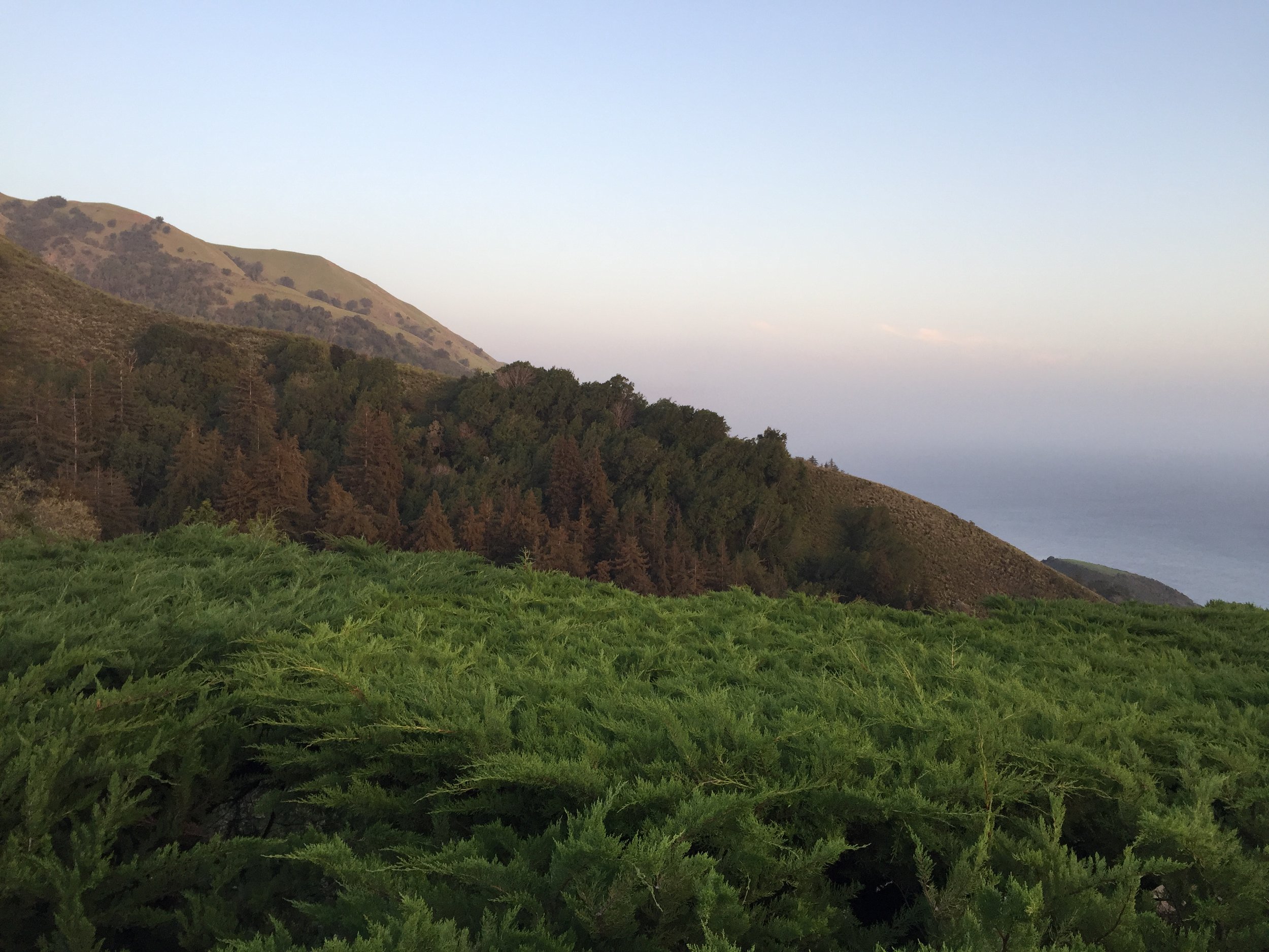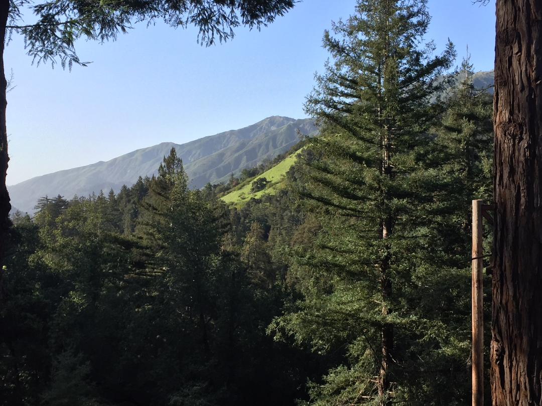 Near the lower pool, a new infinity pool that is also a jacuzzi was only yards from the redwoods, rooted far below in the ravine below the pool. The line of site for the tree and pool was ultimately relaxing and high enough above the forest floor that your eyes were equal to the first branches. Behind the view of the trees was what must be a painted background of the long sloping valley of Pfeiffer Park, the sides of which changed colors as the day went on as the sun shifted its focus.